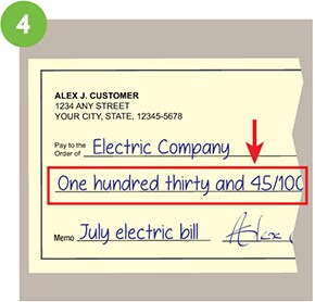 There are two spots on a check where you write the amount you are paying. First, you'll need to write the dollar amount numerically (for example $130.45) in the small box on the right. Be sure to write this clearly so the ATM and/or bank can accurately subtract this amount from your account.